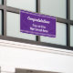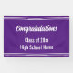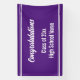 This royal purple and white graduation banner has a text template you can edit to congratulate your school's graduating class. As shown, the top line is a white script that reads 'Congratulations'. The second line can be changed to the class year if necessary. The final line is for the school name. All text can be edited or deleted.