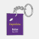 There's a white graduate's grad at the top. Below the cap, the word Congratulations appears in faux (not foil) gold script. At the bottom, you can add the graduate's name and year of graduation (Class of 20##) in white text. The keychain is purple.
