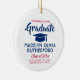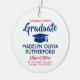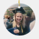 Commemorate the graduate's achievement with a custom photo red, white and blue round graduation Christmas ornament. Picture and all text are simple to customise. Include school name and degree, congratulations, thanks mum and dad, or other message of your choice. Design features a white background, blue graduation cap, personalised modern typography name, school, & class year, and one photo of your choice, such as a senior picture or image from the commencement ceremony. Makes a thoughtful keepsake gift idea and an elegant addition to Xmas home decor. Congratulations to the graduate!