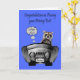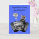 Congratulate your step son on passing her driving test with a racoon driving a car with exhaust coming out the back and sweet written on the license plate. The car is from J. Rett Grapics