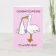 A giant cartoon stork holds a baby boy in a white sheet which hangs from the stork's beak. The image has pastel pink background.