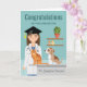 Congratulate a veterinary student on their graduation with the help of this personalizable design featuring Destei's original cute cartoon illustration of a veterinarian woman in an examination room of a veterinary clinic. The veterinarian is wearing a black graduation cap with a yellow tassel, a white laboratory coat, blue scrubs and she has a stethoscope around her neck. The veterinarian has brown hair and a smiling face expression.