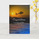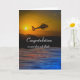 Congratulations on First Solo Flight in Helicopter, paper greeting card. Congrats on your first solo spin. Dramatic scene of a helicopter flying over water with a sunset sky and setting sun behind it. Change the text and font on the cover of the card as you like. Art, image, and verse copyright © Shoaff Ballanger Studios, 2022.