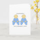 Two adorable twin babies in blue outfits with the words 'Congratulations you're Grandparents to twins!'