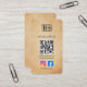This is a uncluttered brown parchment coloured connect with us business card template that has the Instagram and Facebook Icons on the front side bottom and the username for your accounts below the icons. Your website is shown below the QR code. You can link any URL to the QR code, it's up to you. The template shows a website but you can change it you a social media page, a booking page, a portfolio link. For the logo section you can have a logo image, a headshot or another image. The possibilities are endless. On the backside you have your logo and business information. If you need help with your design or need help adding different social icons just click on the message button and I will quickly get back to you to assist you. Thanks, Sandy