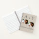 Beige background notebook journal with two small white-trim photos connected by a dotted thread line. Above the images are large serif initials. Below, a soft script reads “Woven in Love,” adding a meaningful touch to this faded charcoal design.