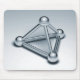 A mousepad with a 3d CGI rendered images of a three sided reflective metallic pyramidal structure made of tube connected spheres.