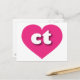 This postcard features a vibrant and shapely hot pink heart containing the bold, rounded, white lower case letters ct, a playful version of the abbreviation for state of Connecticut, the constitution state. The reverse side of the postcard is blank, awaiting your handwritten sentiments or customised text.