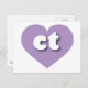 This postcard features a cool lavender heart containing bold, rounded, white lower case letters ct, a playful version of the abbreviation for Connecticut, the constitution state. The reverse side of the postcard is blank, awaiting your customised text or handwritten sentiments.