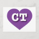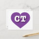 This postcard features a vibrant purple heart containing the bold, white, upper case letters CT, the official abbreviation for Connecticut, the constitution state. The reverse side of the postcard is blank awaiting your handwritten sentiments or customised text.