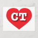 This postcard features a vibrant red heart containing the bold white upper case letters CT, the official abbreviation for Connecticut, the constitution state. The reverse side of the card is blank, awaiting your customised text or handwritten sentiments.