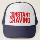 CONSTANT CRAVING fun and ironic slogan on trucker hat, red, funny typographic statement, inspired by tv comedy character frank rossitano. constant and perpetual cravings.
