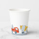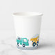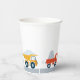 Four hand-drawn trucks encircle this paper party cup. Perfect for your construction birthday party!