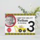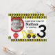 Construction kids 3rd Birthday party invitation featuring a digger scooping and bright yellow and black warning stripes. Perfect to invite your son's favourite friends to his construction / building birthday party. Customise with your own birthday details and photo. Uniquely designed and illustrated by Sarah Trett.