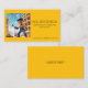The image shows a smiling cartoon of a construction worker ready to start the job, in a bright blue morning , holding his tools surrounded by heavy construction machinery and tall tows. Behind him is a building under construction. This business card can be customised easily according to your needs.