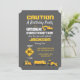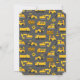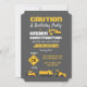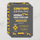 Cute construction trucks birthday party invitation. Grey, yellow, black and white colour scheme with construction truck, caution sign and construction cone pattern.