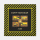 This design features four classic construction trucks in bold yellow arranged together on a brown and black background. It includes other construction items like guard rails and traffic cones and black and yellow traffic stripes. We have you covered for a construction trucks themed party: supplies, decor, delicious treats and meaningful personalised gifts!