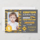 Cute construction trucks pattern photo birthday party invitation. White yellow and grey colour scheme with construction vehicles, caution signs and construction cone pattern on a white background. Customise the text and photo!
