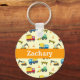 A cute and colourful construction vehicles theme pattern keychain for the boys. The pattern is make up of lots of construction elements like a red and yellow dump truck carrying the debris, an orange excavator, a green front loader pushing dirt, a blue and yellow concrete mixer, orange and white cones and a yellow and black construction zone barrier. Personalise child's name within space available. Perfect for boys who love construction vehicles, toys and machines!