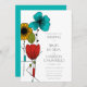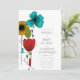 This customisable wedding invitation has a clean and modern look. It features a floral illustration inspired by Art Nouveau design in black, bright turquoise blue, red, light green and golden yellow. Your custom text is in a clean sans serif font.
