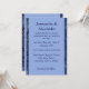 This wedding invitation features a light blue background, edged by a patchwork pattern in mainly shades of blue. Pretty and contemporary.