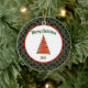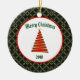 This ceramic Ornament has a green diamond pattern background. In the centre, there's a white circle with a red border and a red contemporary Christmas tree design. Merry Christmas text can be personalised. The back of the ornament is similiar and the text can be personalised with own holiday message.
