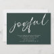 Contemporary Joyful Script Christmas Party Green. Available digitally and printed. Easily personalise with your party details. Joyful is in a large modern playful set Calligraphy in white which can be changed to another colour if you so wish as can the dark green background on each side via the Edit further option.