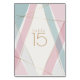 Contemporary Modern Geometric Stripes Table Number Card created by The BarefootBride™ Colours are: Smoky Teal , Light Rose and Cloud White with thin gold accent stripes. A nice geometric abstract design for the modern wedding. All Text is customisable.