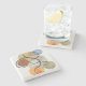 The coasters are gorgeous, a quality feel and heavy weight. They look like a precious archeological find. A rustic stone juxtaposed with a modern floral black and white print. I like the way the print goes slightly imperfect on the cut stone edges giving them a kind-of natural beauty.