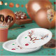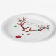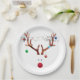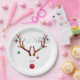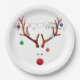 A delightful, bright, classic yet contemporary Christmas party paper plate featuring a modern stylised red nosed reindeer with colourful strings of Christmas lights and ornaments in its antlers. The strings of lights spell out the text "Merry Christmas!"
