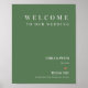 Contemporary Sage Green welcome To Our Wedding Poster . A great way to welcome the guests to the wedding Party. This Cute minimalist modern Wedding Welcome poster has a Sage Green background with text written in white font and space to add the names of the couple along with the wedding date . Customise the poster by changing the names of the bride and groom and the wedding date . For anu further customisation , feel free to contact me at mypaperlove2021@gmail.com