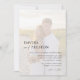 Photo wedding invitation featuring your names in elegant serif bold font with "and" and "reception to follow" in modern handwritten script lettering. Personalise with your wedding details beneath.