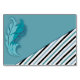Table card with black, teal, blue and white diagonal stripes along the right and bottom side of card. Upper left is a grouping of 3 stylised feathers in coordinating colours on a teal-blue background.