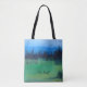 This unique tote bag has an original landscape painting printed on them. The spooky winter woodland landscape image covers the whole of the front and back . The colourful little landscape is an original watercolor painting and is in the colours of green and blue. In the sky you can see a few birds flying above the silhouette of the trees. This original woodland image really stand out on this original art bag.