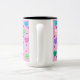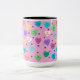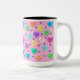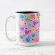 A conversational candy heart mug on a solid pink background with tiny purple hearts throughout. Perfect for Valentine's Day.