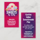 Sweets business card for a cookie and candy or confections business featuring a scalloped cookie, wrapped candies and chocolate truffles, your choice of colour scheme and fonts.