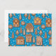 Hand drawn vector pattern featuring various gingerbread houses, fir trees, snowflakes and crescent moon-shaped cookies on blue with falling snow