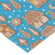 Hand drawn vector pattern featuring various gingerbread houses, fir trees, snowflakes and crescent moon-shaped cookies on blue with falling snow