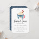 Cute illustrated Christmas snowman winter hot cocoa mug, holiday party invitation. Trendy typography design style template text with blue and white pattern backing.