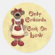 "Only Cowards Cook on Low!" Funny saying for hobby cooks or cooks by profession. Fancy wordart, and a cute bear mum wearing a red dress with an apron and carrying the tools of her trade. A humourous design for your favourite cook!