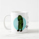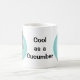 "Cool as a Cucumber" in black text in the centre of the mug. Either side of the mug there is an illustration of a funny cucumber wearing shades, a leather cut and brown boots, looking as cool as cool can be.