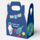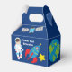 A cool outer space astronaut themed party favour box for a kid's birthday. Features an awesome child astronaut next to a rocket ship in the galaxy. The sides are decorated with planets, spaceships, and the planet Earth. Customise with your thank you message for a galaxy themed party favour package.