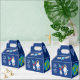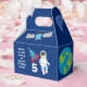 A cool outer space astronaut themed party favour box in blue for a kid's birthday. Features an awesome child astronaut next to a rocket ship in the galaxy. The sides are decorated with planets, spaceships, and the planet Earth. Customise with your thank you message for a galaxy themed party favour package.