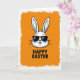 This card features a stylized white bunny head centered on a saturated orange background, with long ears reaching upward and a small smile that suggests a friendly, slightly flirty confidence 🐰. Dark sunglasses sit across its face, giving the character a cool, self-assured look, as if it’s sharing a private joke with someone close. Thick black outlines define the face and ears, and a single visible tooth adds a cute, teasing detail that can read like lighthearted romance or easy friendship. The orange backdrop isn’t flat; it has a worn, speckled texture that softens the scene and makes the character feel more approachable. Around the edges, irregular white splatters form a rough border, like paint dabs framing a poster. Near the bottom, a seasonal greeting is set in black sans-serif letters, centered and spaced for quick reading, with 🌷 adding a gentle spring touch. The high-contrast palette—white character, black linework and text, and the orange field—stands out sharply, with the white splatter border most noticeable along the top and sides.