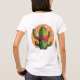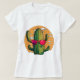 This vibrant T-shirt design features a stylised cactus with a pair of red sunglasses against an orange backdrop that suggests a sunset. The cactus has three main branches and two smaller offshoots, detailed with lines to represent the spines. White fluffy clouds are scattered in the background, adding to the laid-back, cool vibe of the design.
