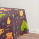 A tablecloth designed with a cute camping pattern. Camping themed items such as an orange campfire, a green tent, an acoustic guitar and other nature