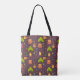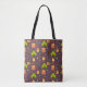 Tote bag designed with a cute camping pattern. Camping themed items such as an orange campfire, a green tent, an acoustic guitar and other nature