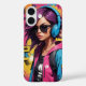 A cool girl wearing sunglasses, headphones and colourful clothes with purple hair. the background is full of splashes of paint. street art