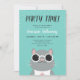 Cool birthday party invitation in turquoise with a grey cat wearing white sunglasses, white confetti, and PARTY TIME written in big black calligraphy letters.