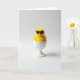 This design shows a fluffy yellow chick-like bird peeking out of a cracked white eggshell that sits neatly in a simple egg cup, all set against a bright white studio background. Tiny round dark sunglasses rest on its face, giving it a confident look that feels like a flirty wink toward someone just out of frame 🐇. Soft, gentle lighting falls from above, tracing the jagged shell edge and laying faint shadows beneath the cup without pulling attention away from the little character. The rich yellow feathers stand out strongly against the pale setting, and the sharp detail makes each strand of down look touchable. Near the top, a short Easter greeting appears in small, rounded lettering, printed in a light gray tone that stays subtle. A smaller line of text sits near the bottom in soft pastel pink, like a quiet note meant for a close friend 🌷. The broken shell curves around the bird’s cheeks, and the glossy lenses catch a tiny white highlight.